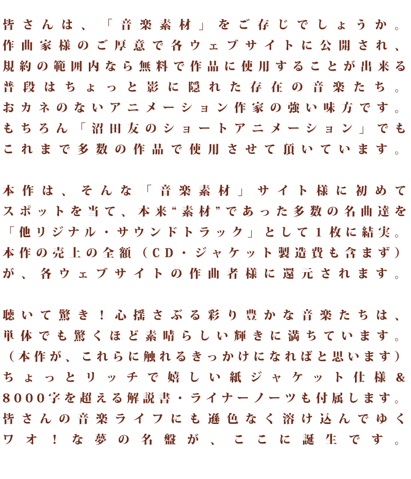 【沼他サントラ-4】『甘茶の音楽工房』甘茶さま(https://t.co/CJKk0nO1dI )。本アルバムには2曲を収録。モーレツな勢いで楽曲数を伸ばしていらっしゃる、今一番勢いがある音楽素材サイトさまです! https://t.co/p3uxfPVkxS